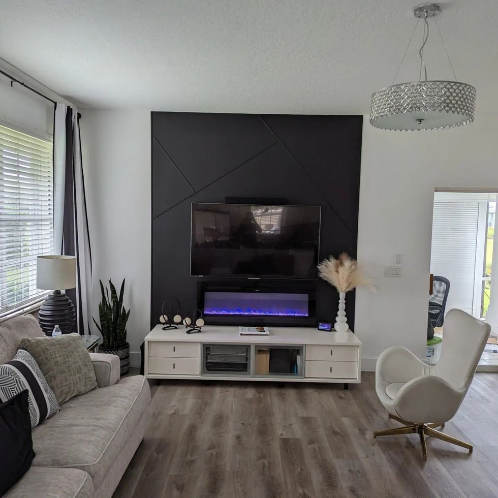 This project showcases elegant interior designs with detailed trim work, chandeliers, and modern furniture. It also includes images of a modern living room with a fireplace and mounted television.
